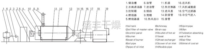 燃料通过燃烧器燃烧,产生高温燃气。并借助具有强化换热措施的热风炉将高温燃气的热量传导给被加热的空气,高温燃气经热量散发后温度降低至250℃后排到大气中。需加热的空气通过选配的鼓风机强送入热风炉,吸热后温度升至额定值从热风出口处送出,当热风温度达到额定温度上限时,燃烧器会自动停止燃烧或自动转为小火焰燃烧,当热风温度降低到额定下限温度时,燃烧器又会重新点燃运行或转为大火燃烧,升温的速度可以调节进风阀的开度来实现。